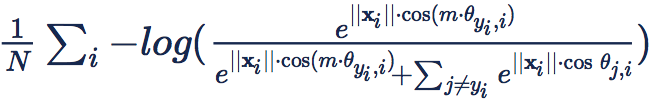 [SphereFace] 提出的 loss 的具体形式是,这个与 L2-Softmax 的差别仅仅就是把当前 sample 与所属类别的夹角