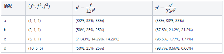 Softmax 能够放大微小的类别间的 logit 差异,这使得它对这些微小的变化非常敏感,这往往对优化过程非常有利。我们用一个简单的三分类问题以及几个数值的小实验来说明这个问题。假设正确的类别为 1。如下表的情况(d)所示,正确类别的概率才 1/2,并不高。