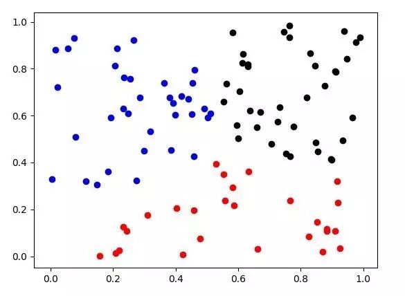 为了更直观的描述,这次在图上做一个展示,由于图像上绘制二维比较直观,所以数据调整到了二维,选取100个点绘制,聚类类别为3类