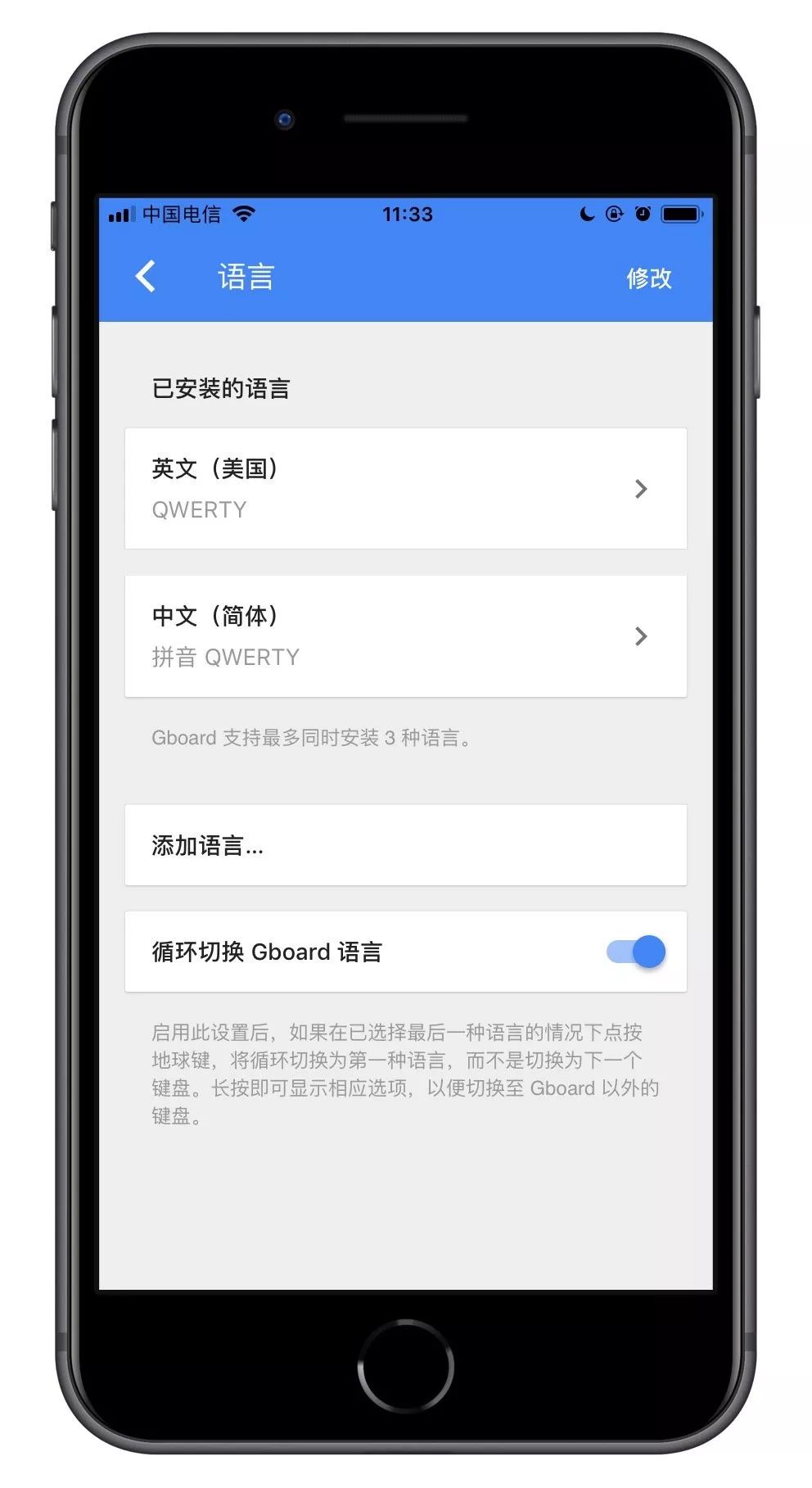 不过 Gboard 自有办法。以 iOS 系统为例,在 Gboard 设置中开启「循环切换语言」后,点击语言切换就能够只在 Gboard 设置的几种语言当中进行循环切换,避免换回 iOS 的自带输入法。由于 Gboard 本身支持上百种语言,实现一款输入法打天下几乎不是梦,偶尔碰上的确需要切换输入法的需要,也可以长按语言切换键进行更改。