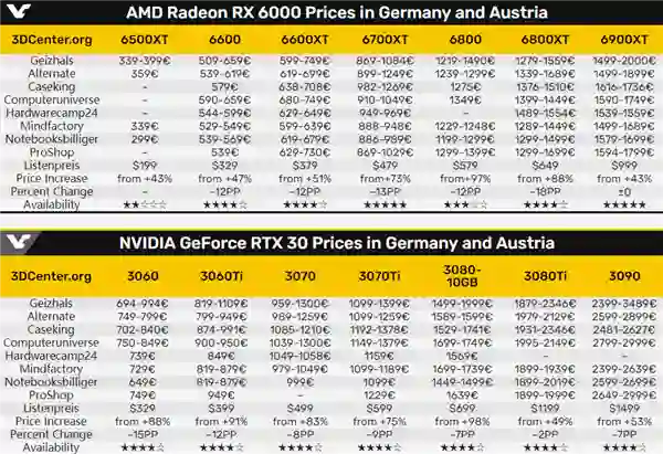 德国市场的统计显示,截至 3 月中上旬,英伟达 RTX 30系列、AMD RX 6000系列的平均溢价幅度已经分别持续降至 41%、35%,库存情况也稳定改善。而美国 eBay 上的数据显示,最近一个月来,显卡整体平均价格下降了 8.8%,最多的甚至降低了超过 20%,而相比去年 12 月份整体已经下降 25%。