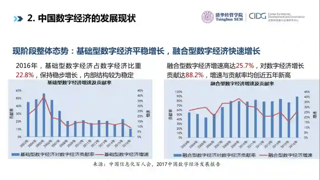 据相关报告,实际上2016年基础型数字经济的比重占两成左右。而融合型的经济增长高达25.7%,促进数字经济增长贡献将近九成。