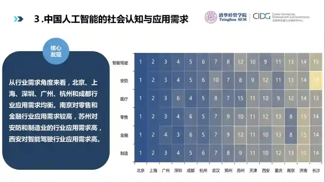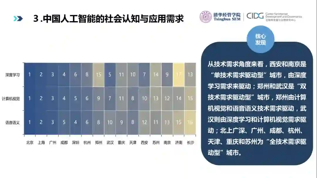 总的来说,在全国层面,无论从社会认知还是应用需求角度,中国从2017年3月开始正式进入人工智能驱动的经济数字化转型阶段。人工智能的社会认知从基本认知程度发展到深层次专业和技术认知;技术应用需求整体上一直呈上升趋势,行业应用需求在2017 年3月进入跃升期。在区域层面,无论是人工智能社会认知还是应用需求方面,南方城市在排名上都比北方城市具有优势,长三角地区尤为突出。同时,排名靠前的城市集中在北上广深和各省会城市。从技术应用需求角度看,不同城市可分为全技术需求驱动、双技术需求驱动和单技术需求驱动三类。从行业应用需求角度,不同城市可分为全行业需求驱动和部分行业需求驱动两类。