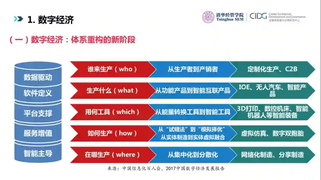 我们中国信息化百人会2017年数字经济报告指出我们现在正经历一个数字经济的拐点,首先面临的就是体系重构:数据驱动、软件定义、平台支撑、服务增值、智能主导。