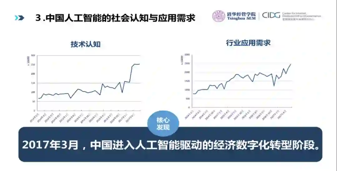 我们发现无论是最深层次的技术认知还是最广范围的行业需求应用,都在2017年3月开始进入一个拐点。基于此,我们提出从2017年3月起,中国真正进入了人工智能驱动的经济数字化转型阶段。