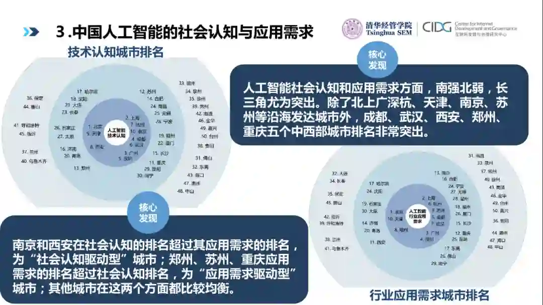 各地的人工智能的发展及社会需求有所不同。我们将排名前五十位的城市进行了分析,前十位作为第一梯队,第十一到第三十位作为第二梯队,第三十一到五十位作为第三梯队。在人工智能社会认知和应用需求方面,南强北弱,长三角尤为突出。除了北上广深杭、天津、南京、苏州等沿海发达城市外,成都、武汉、西安、郑州、重庆五个中西部城市排名非常突出。南京和西安在社会认知的排名超过其应用需求的排名,为“社会认知驱动型”城市;郑州、苏州、重庆应用需求的排名超过社会认知排名,为“应用需求驱动型”城市;其他城市在这两个方面都比较均衡。