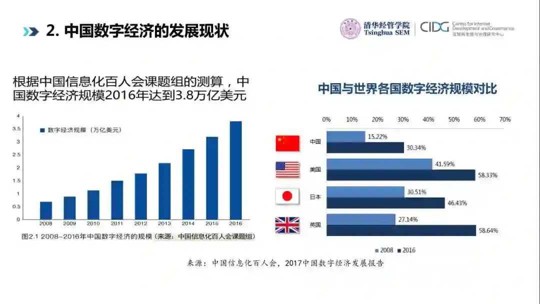 中国数字经济的发展跟西方最大差异是什么?中国数字经济发展最基本前提条件是什么?我们是工业化、城镇化、现代农业化和信息化等四化叠加,而西方是先有工业化、城镇化、现代农业化,然后才有信息化。根据我们中国信息化百人会的测算, 2016年中国数字经济占GDP的比重达到了30.2%。