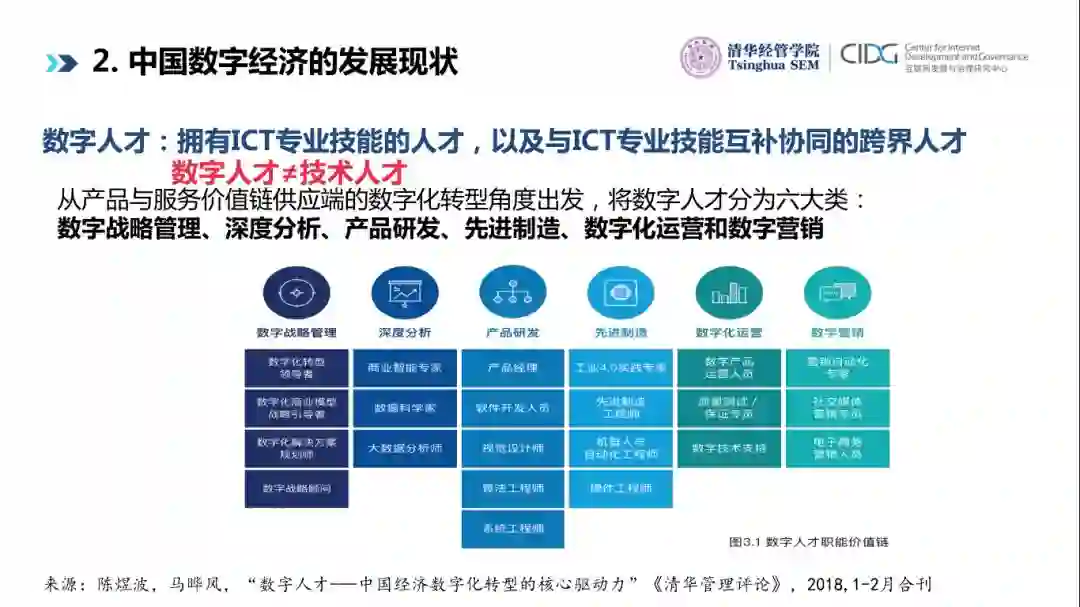 但是中国数字人才结构性问题非常突出:不均衡、不充分。我们将近90%的数字人才在产品研发、数字化的运营上,而深度分析不到4%,数字战略管理0.8%,先进制造0.84%,数字营销0.35%。