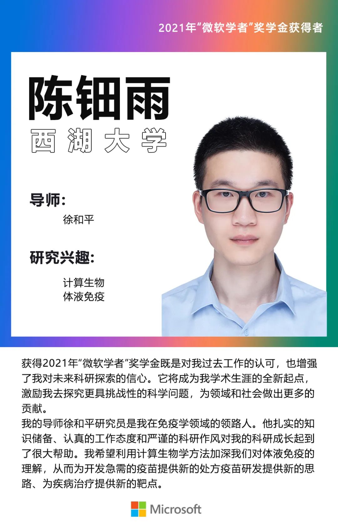 本次“微软学者”奖学金的获得者们既脚踏实地也仰望星空:他们在认真探索科研的同时,怀揣着以科学、技术造福社会的赤子情怀。这也与“微软学者”奖学金赋能下一代杰出的计算机科研人才的初衷相吻合。