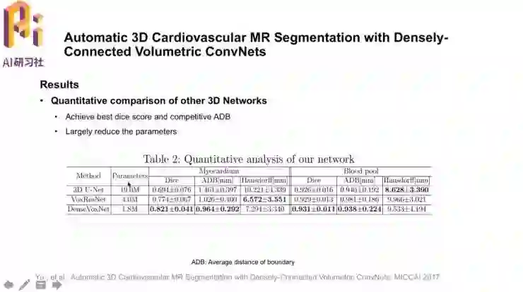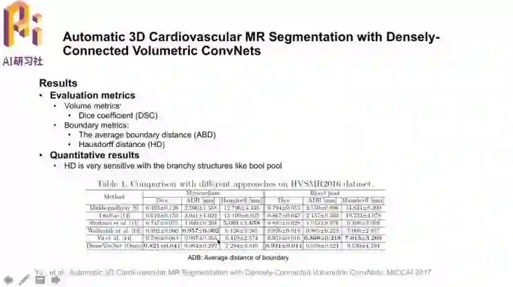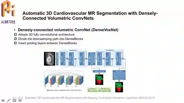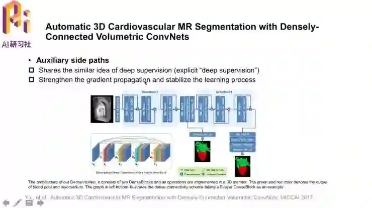 其中用到的DenseNet结构也是今年提出的新网络结构,比之前的ResNet有更密集的连接。这种网络结构的好处在于,1,每一层都能直接接收到指导信息,也就是隐式的“深度监督”;2,特征有很高的复用程度;3,能够降低feature map对应参数的数目这篇论文「Automatic 3D Cardiovascular MR Segmentation with Densely-Connected Volumetric ConvNets」也就来自陈浩博士团队,任务目标是全心脏的三维体积分割,采用了三维全卷积神经网络,并且把下采样的路径分成了不同的DenseBlock块,在不同的DenseBlock中增加池化层增大感受野。