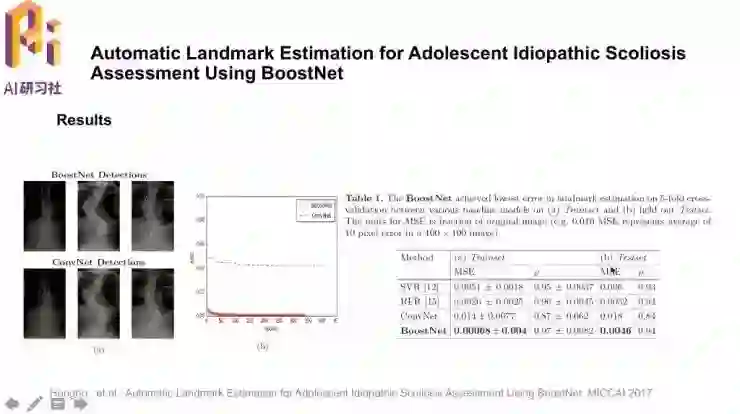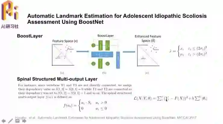 输入X光图像,经过卷积层后,BoostLayer的作用是去除大于两倍标准差σ的偏离值,再经过带有脊椎形状约束的Spinal Structured层之后,就可以输出关键点的定位结果。