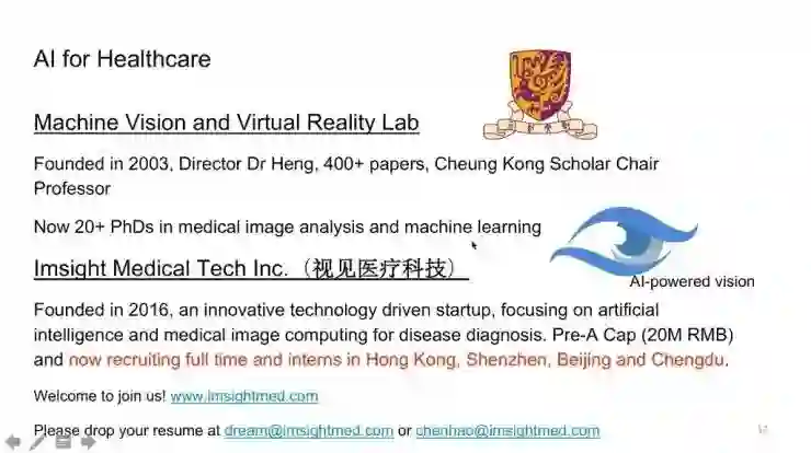 最后陈浩博士简单介绍了一下他们的实验室,在王平安教授带领下,现在有二三十位PhD共同在做医学影像分析和机器学习方面的研究。陈浩博士本人也是在今年年初创立了视见医疗科技,获得了几轮融资后也在招聘全职和实习生,欢迎发简历给他们,共同在人工智能医疗领域中做一些有意思的、能对世界产生影响的事情。