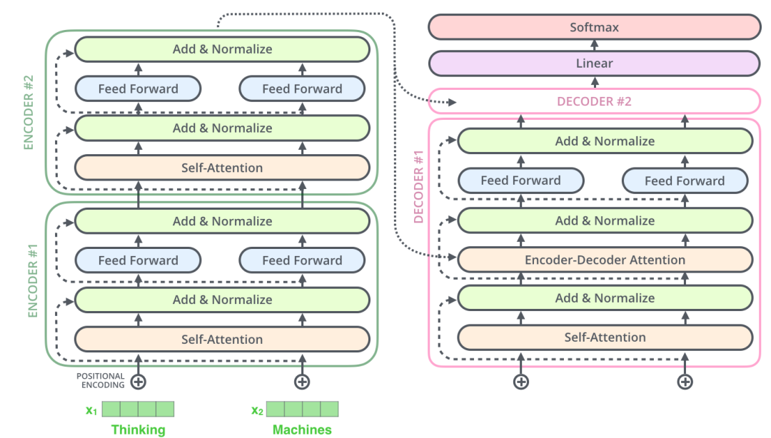 最后我们就像搭积木一样,把前面的部分组建成一个完整的transformer网络,如下图