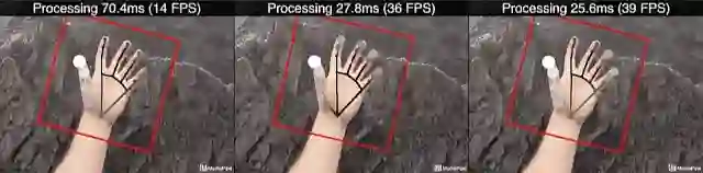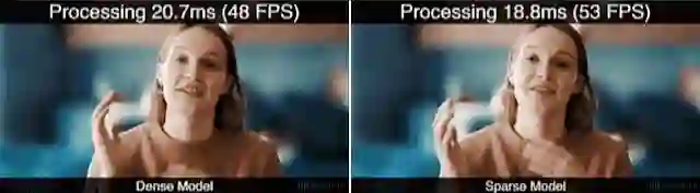 相同质量的密集模型(左)、蒸馏模型(中)和稀疏模型(右)的执行时间比较情况:密集模型的处理时间是稀疏模型或蒸馏模型的 2 倍。蒸馏模型取自官方 MediPipe 解决方案。密集和稀疏网络演示已发布