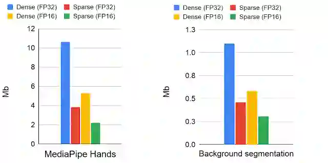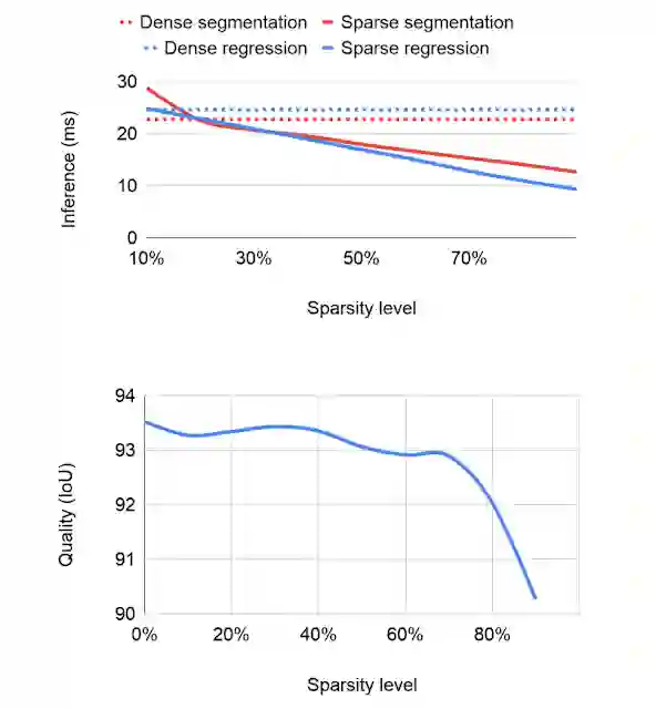 我们已经证实了,可以对分类任务、密集分割(例如,Meet 背景模糊)和回归问题 (MediaPipe Hands) 进行稀疏化,这会给用户带来实实在在的好处。例如,对于 Google Meet 而言,稀疏化将模型的推理时间缩短了 30%,从而令更多用户能够访问更高质量的模型。