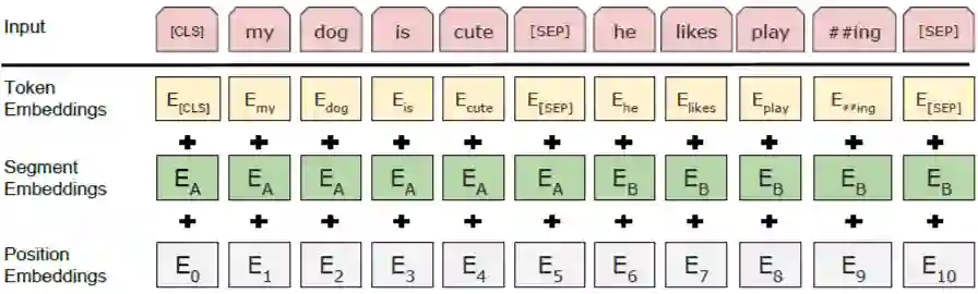 除此之外,包含了三个嵌入:Token Embedding、Segment Embeddings 和 Position Embeddings。值得注意的是,Token 不是 word 级别,而是使用 WordPiece 切分的,共包含了 30000 个子词。该操作可以有效降低 OOV。