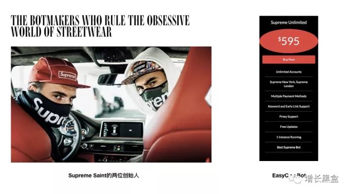 然而,有两个聪明人想到了一个妙招:用脚本写机器人,不停注册账户,帮助消费者在官网上下单抢货。很快,他们做出了名为Supreme Saint的机器人程序,用户们可以支付10-100美金不等的费用,使用机器人帮助他们抢货。Supreme官网正式发售的时间是周四中午11点,用户们则可以在9点到10点预约这个机器人。脚本会记录你的信用卡付款信息,收货地址等,然后自动连接Supreme官网服务器,填写表单付款 - 这比任何人工操作都要快,能够让你以大概率抢到新品。