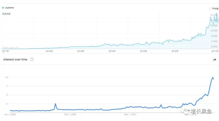 看看Google和百度的搜索趋势,Supreme依然处于高速的增长期。
