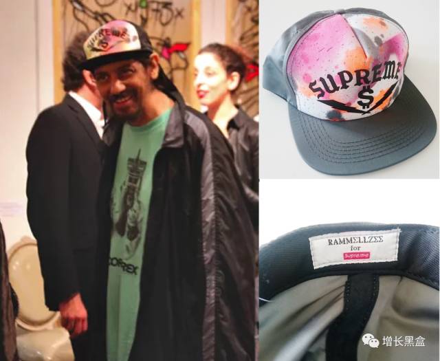 其实在最初,Supreme并没有直接找所谓”大众名人“合作,而是去拜访了一些街头艺术家和音乐人。Supreme提出的合作建议也十分特殊:邀请他们跟公司一起设计新的产品。这在当时(90年代),还是一个非常新鲜的概念。通过真诚的沟通,Supreme终于邀请到了知名涂鸦艺术家Rammellzee,与他联合设计了一款卡车帽 - 用他标志性的涂鸦渲染帽子的顶部,并在内部的标签绣上他的签名。