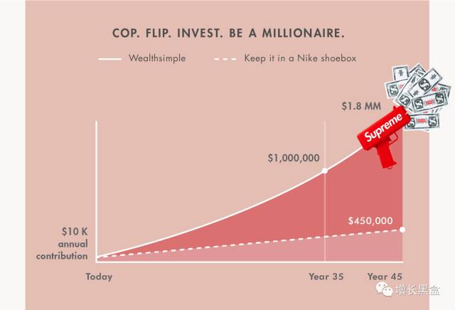 Supreme的黄牛市场究竟有多发达?一家投资公司进行了一项有趣的计算:假设你的初始资金是10000美金,可以购买149件Supreme商品。经过倒卖,平均每件商品可以给你带来67美金净利。这样一来,你每年就能有10000美金收入。如果在今后的若干年,你每年都投入10000美金做这项生意,35年后你将入账100万美金!多么稳健的投资方式!