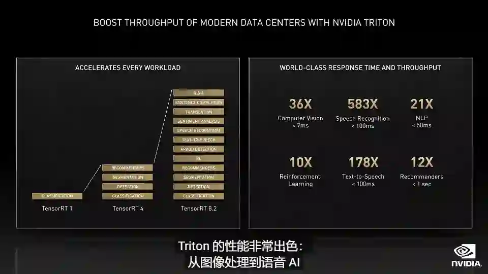 使用Triton推理服务器,Megatron 530B可以在两个NVIDIA DGX系统上运行,将CPU服务器上的处理时间从一分钟多缩短到0.5秒,从而实现在应用程序上快速、实时地部署大型语言模型。