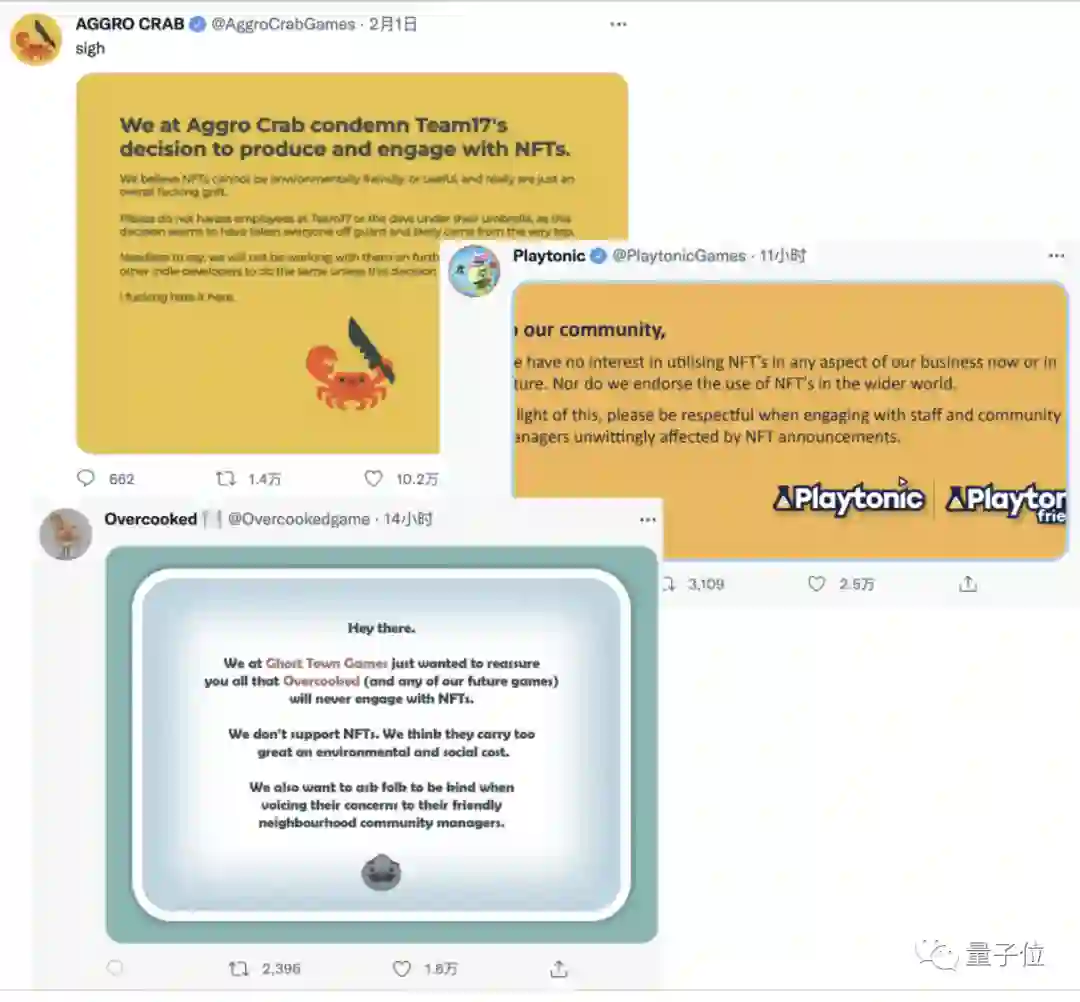 随后两家游戏公司承诺永不涉足NFT的声明也收到大量点赞,其中包括《胡闹厨房》开发商。