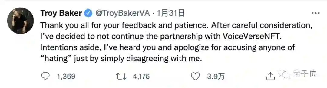 近日,他也宣布了终止与区块链公司VoiceVerseNFT的合作关系。