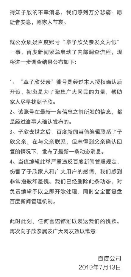 百度表示伤害子欣家人和广大用户的感情,感到非常抱歉和羞愧,已经删除次条动态,对负责编辑予以开除处理,将会全面复盘百度新闻管理机制。