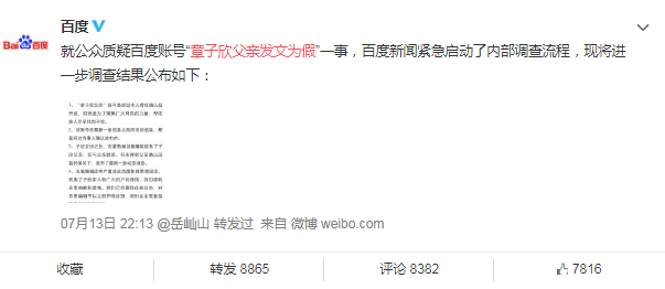 消息发布后,有媒体质疑该消息真伪,在整个过程中,百度先表态“章子欣父亲”账号为真,又在3个小时候承认账号最后一条消息的确是假消息。