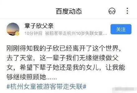 7月13日,章子欣去世消息传出,就在警方尚未认定结果之前,认证为“章子欣父亲”的百度账号迅速发布了一条动态,称“刚刚得知我的子欣已经离开了这个世界,去了天堂,这一辈子我们无缘继续做父女,希望下辈子她还是我的女儿,让我能继续照顾她……”