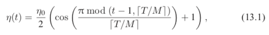 其中,η0 为初始学习率,一般设为 0.1 或 0.2。t 为模型迭代轮数(即 mini- batch 批处理训练次数)。T 为模型总的批处理训练次数。M 为学习率“循环退火”(cyclic annealing)次数,其对应了模型将收敛到的局部最优解个数。式13.1利用余弦函数 cos() 的循环性来循环更新网络学习率,将学习率从 0.1 随 t 的增长逐渐减缓到 0,之后将学习率重新放大从而跳出该局部最优解,自此开始下一循环的训练,此循环结束后可收敛到新的局部最优解处,如此循环往复......直到 M 个循环结束。因式13.1中利用余弦函数循环更新网络参数,所以这一过程被称为“循环余弦退火”过程 (cyclic cosine annealing)[61]。