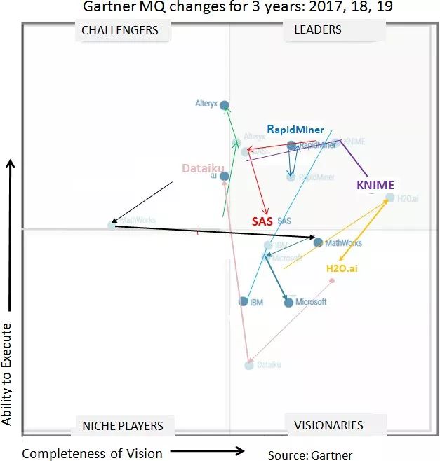 这个象限在2014年至2017年有同样的4家公司(IBM、SAS、RapidMiner和KNIME),但2018年发生了变化,今年又发生了变化。