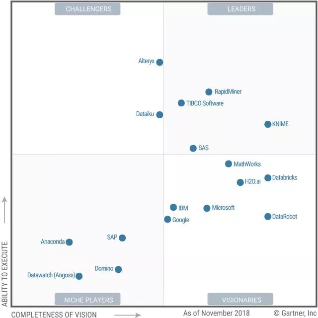 Gartner 2019年数据科学和机器学习平台魔力象限(截至2018年11月)