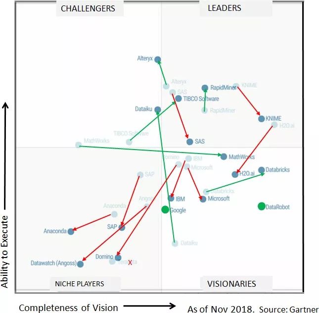 图2显示了比较2018年魔力象限(灰色背景图)和2019年魔力象限(前景图)的结果,箭头连接代表同一家公司的圆圈。如果公司位置大幅改善(远离原位置),箭头标以绿色,如果公司位置下降,箭头标以红色。绿色圆圈表示2家新公司(谷歌和DataRobot),红色X标志着今年跌出象限的供应商(Teradata)。