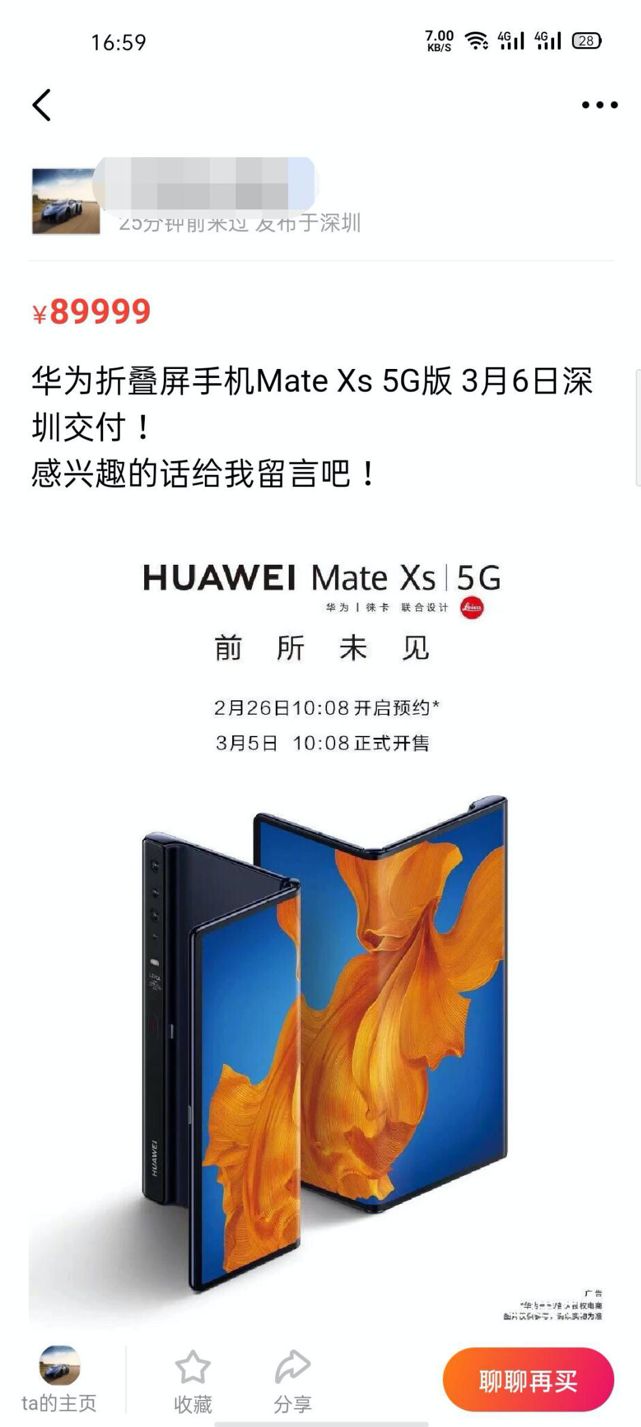 目前Mate X已经停产停售,但闲鱼上的标价仍旧保持在20000元以上;而尚未正式开售的Mate Xs已经在闲鱼上出现了89999元的最高标价。