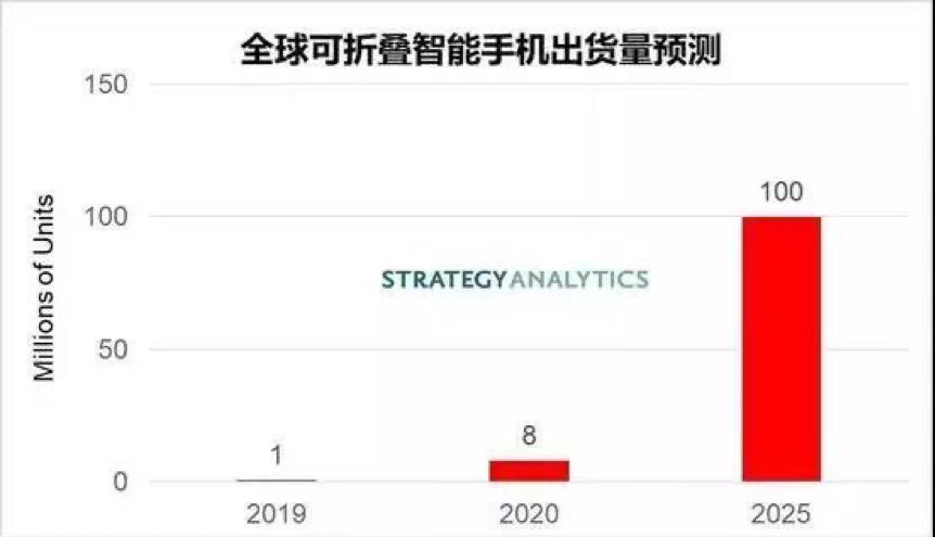 根据中信证券的预测,2020年折叠屏手机的出货量将超520万台,2025年折叠屏手机出货量将超5000万台;而Strategy Analytics对折叠屏手机未来的数据则更为乐观,Strategy Analytics分析师表示,可折叠手机将是未来十年高端智能手机市场增长最快的细分市场,2025年的出货量将达1亿台。