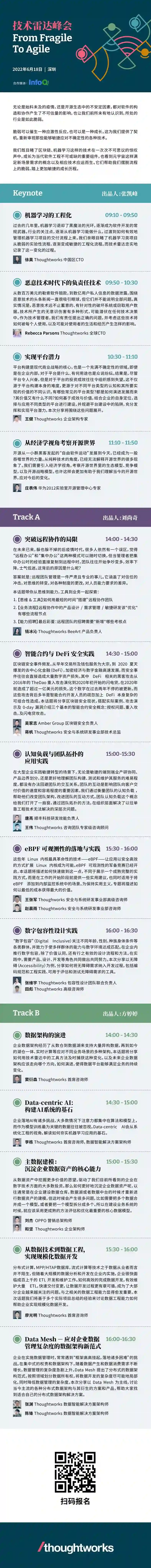 技术雷达峰会是 Thoughtworks 围绕技术雷达主办的一场线下技术互动和分享活动,本次大会于 2022 年 6 月 18 日(星期六)于深圳万怡酒店举行,并特地增加了线上形式,将有多位重磅嘉宾跟大家分享深度的技术洞察和趋势预测。从现在开始,通过 InfoQ 报名,完成审核后,即可免费领取大会门票!