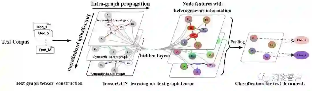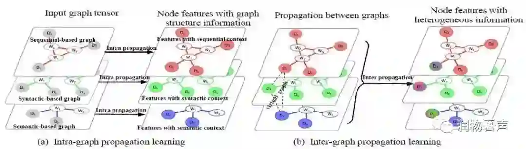 论文摘要:相对于LSTM等序列模型,图神经网络能够以更加灵活的方式获取复杂的结构信息构建表示。而单一的图结构不足以有效的刻画丰富的信息,因此多图联合学习至关重要。本研究中我们提出了一种通用的多图联合学习架构:张量图神经网络模型TensorGCN(见如下图-1)。该联合学习框架通过图内和图间同时进行消息传递的方式进行多源异构图信息的有效融合。我们将TensorGCN框架应用于文本分类任务(见如下图-2),对文本数据分别建立语义图、语法图、和序列图,并进行多图联合学习,在多个公开数据集上均获得了性能的有效改进,达到了state-of-the-art效果。