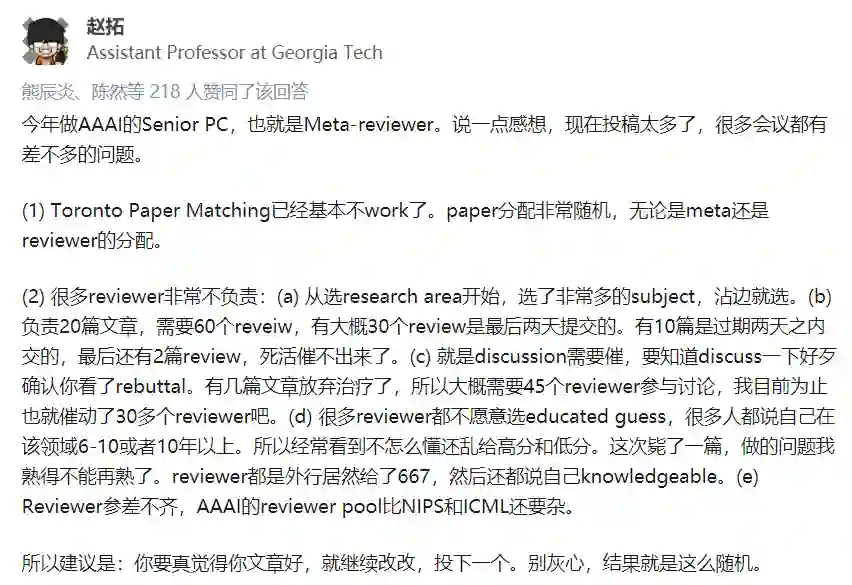 从此次AAAI放榜结果来看,顶会审稿机制不只一次的被吐槽。随着AI研究的火爆,各大顶会都受到了论文翻倍增长的压力。一方面是投稿论文的剧增,另一方面是专业审稿人的严重不足,导致审稿质量大幅下降,引得投稿人怨声连连。