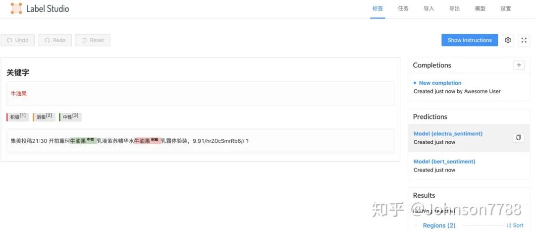 预览图: 关键字情感分类的标注示例,可以关联多个模型的预测结果,例如使用bert和electra2个模型作为ML后端