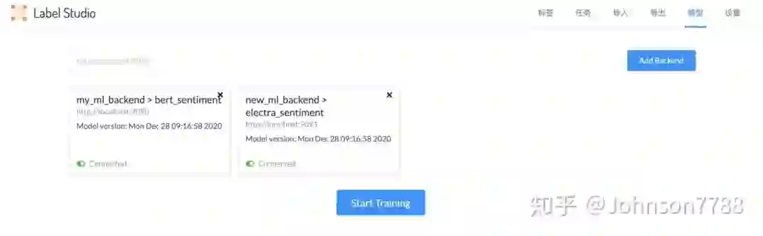 训练和预测的函数也可以是api调用,也可以是参考heartexlabs/label-studio-transformers与transformers集成,这里我调用的是自己写的bert模型和electra模型,2个ML模型作为后端。