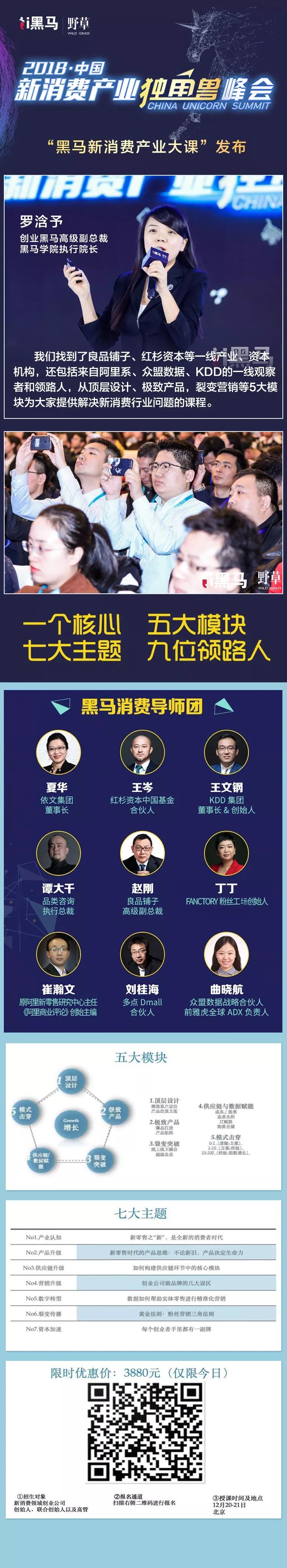 创业黑马联合新消费领域9大领路人,从顶层设计、极致产品、裂变突破、供应链与数据赋能、模式击穿,5大模块,帮助新消费领域的“新产业人”,冲破新消费时代的转型迷雾,实现指数型增长。