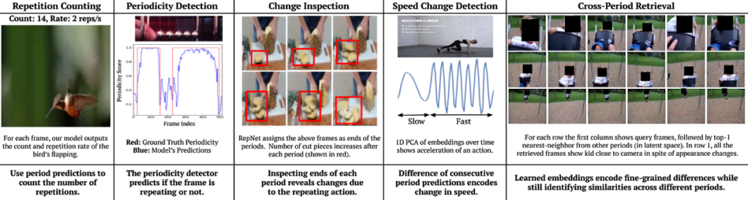 谷歌的 CVPR 2020 论文《Counting Out Time: Class Agnostic Video Repetition Counting in the Wild》在这一研究方向上迈出了重要一步。这篇论文提出了一种可理解多种重复过程的单一模型 RepNet——其中涵盖人类锻炼或使用工具、动物奔跑、鸟类扇动翅膀、钟摆摆动等多种不同的重复过程。之前的重复过程研究大都使用了周期一致性约束来分析有同一动作的不同视频,以便能细粒度地理解它们。谷歌这篇论文则采用了一种不同方案:一种能识别单个视频中的重复模式的系统。