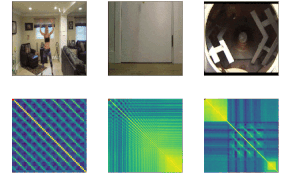 上面展示的日夜循环的时间自相似度矩阵(TSM)示例是一个固定时间段长度重复的理想场景。而对于真实世界视频,TSM 往往能揭示出视频中让人着迷的结构。下面展示了三个示例:跳跃运动差不多算是一个固定周期长度的理想周期动作了;对比之下,由于动能损失,弹跳小球的弹跳高度会在重复过程中逐渐下降。而某人挖铲混凝土的视频前后都有一段无运动的片段。这三个行为对应的学习到的 TSM 也有明显差别,这需要模型关注场景中的细微变化。