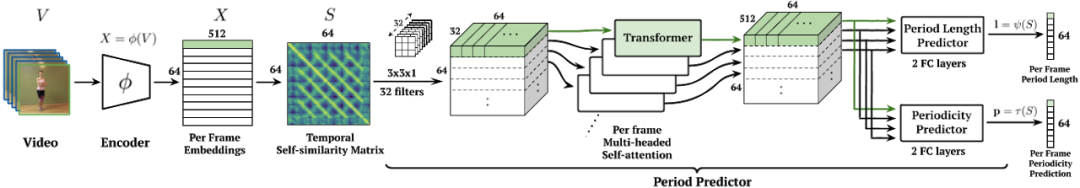具体来说,谷歌以端到端的方式训练了一个机器学习模型,可以直接估计重复的时间段。该模型由三部分组成:一个帧编码器、一个中间表征(称为时间自相似度矩阵)、一个时间段预测器。