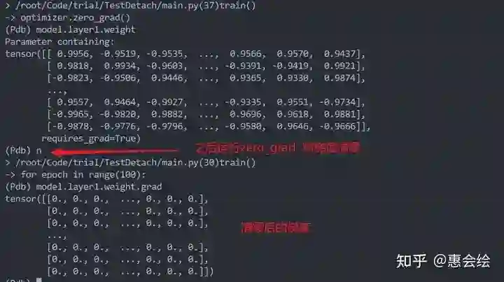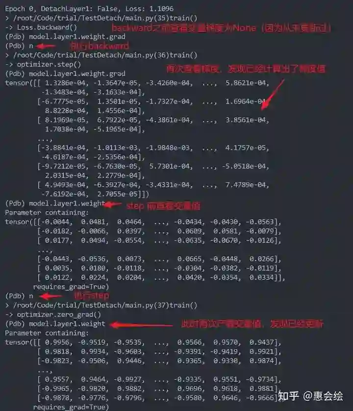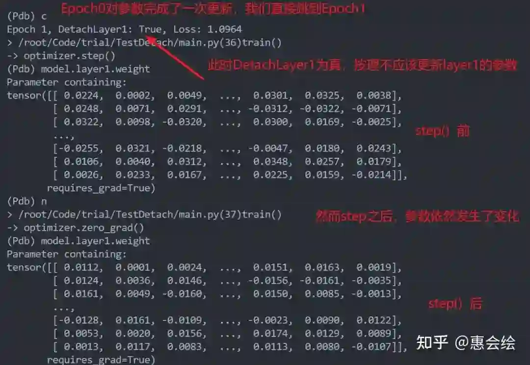 如果你亲自单步调试的话,会发现第一层的参数再一直变化,并没有被固定住,就像是detach没有起到作用一样。进一步观察第一层变量的梯度的话,你会发现梯度确实也是0,但是参数确实也在更新: