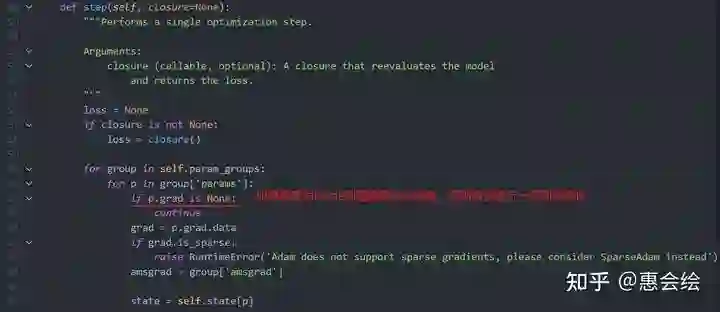 值得一提的是:上面zero_grad将梯度清零,而不是置为之前的None。然后,我们跳转到step的实现部分,注意观察第62行: