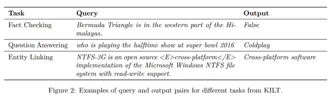 Atlas 遵循文本到文本框架。这意味着所有任务的总体框架是:系统以文本查询作为输入,生成文本输出。例如,在问答任务情况下,查询对应于问题,模型需要生成答案。在分类任务情况下,查询对应于文本输入,模型生成类标签,即标签对应的词。图 2 中的 KILT 基准给出了更多下游任务的示例。许多自然语言处理任务需要知识,Atlas 的目标是通过检索增强标准文本到文本模型,因为检索可能对于模型小样本场景下的学习能力至关重要。