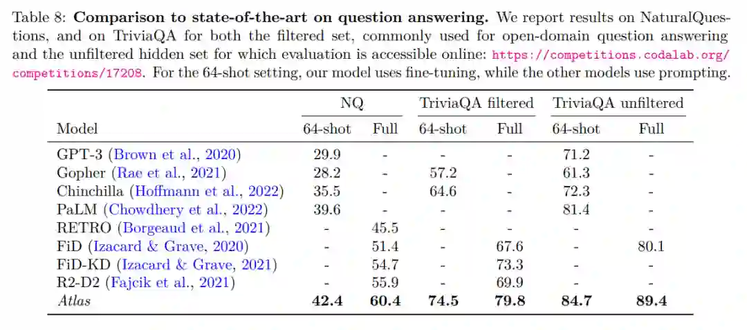 在只有 11B 个参数的情况下,Atlas 使用 64 个训练示例在 NaturalQuestions(NQ)上实现了 42.4% 准确率,比 540B 参数模型 PaLM( 39.6% ) 高出近 3 个百分点,在全数据集设置中(Full)达到 64.0% 准确率。