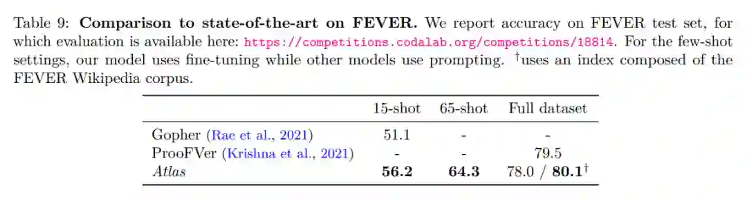 Atlas 在 64-shot 情况下,训练样例采样自全量训练集。Atlas 达到了 64.3% 的准确率。而在 15-shot 的情况下,从每个类中统一采样 5 个样例,与 Gopher 结果比较,Atlas 准确率为 56.2%,比 Gopher 高 5.1 个百分点。在全量训练集上微调 Atlas 模型,达到 78% 的准确率,比 ProoFVer 低 1.5%。ProoFVer 使用专门的架构,用句子级注释训练的检索器,并由维基百科语料库提供与 FEVER 一起发布,而 Atlas 从 CCNet 和 2021 年 12 月的维基百科转储中检索。当给 Atlas 由 FEVER Wikipedia 语料库组成的索引,Atlas 取得了 80.1% 最优水平。